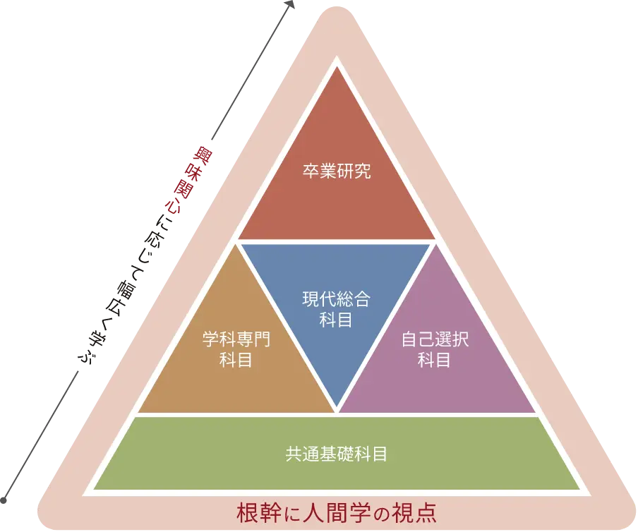 大学4年間の学びの見通しを立て、大学での学びの基礎となる能力を身につける「学びの発見」や、英語をはじめさまざまな言語を学びながら文化の多様性にふれる「外国語」、ICTや数理・データサイエンス・AIの基礎能力を身につける「ICT入門」、そして「人間学Ⅰ・Ⅱ」を全学生が履修します。