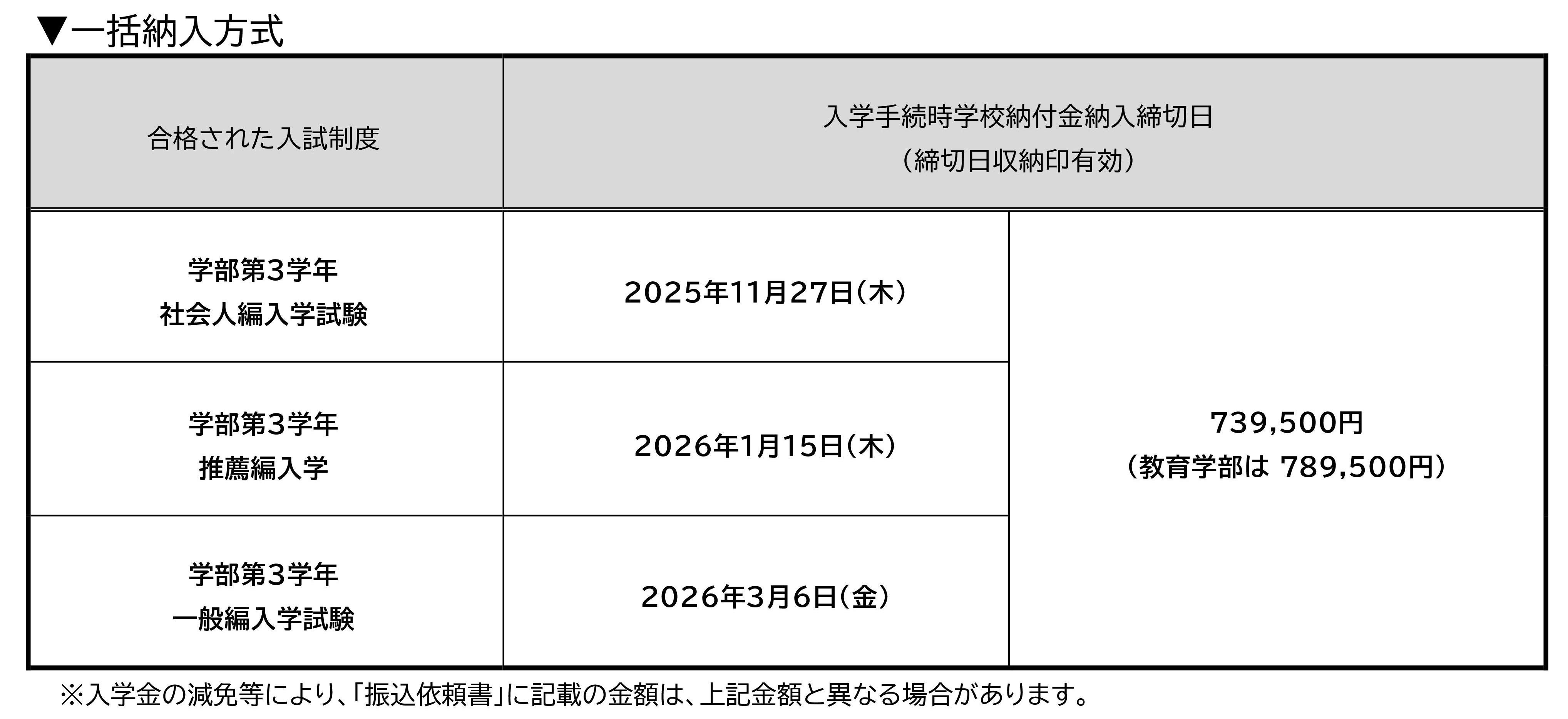 - 入学手続時学校納付金の納入方法は、合格された入試制度により異なります。「入学手続の手引き」をご確認のうえ、締切日までに納入してください。
