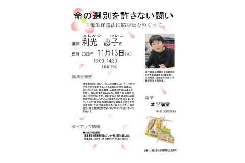 そこで「優生保護法問題の全面解決をめざす全国連絡会」共同代表の利光惠子氏をお招きし、命の選別、優生思想を許さない闘いについて語っていただきます。