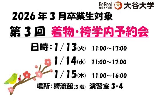 2026年3月卒業・修了予定者を対象に、卒業式日の着物・袴の学内予約会を開催いたします。