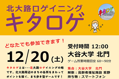 学生チャレンジ企画「地域に寄りそうプロジェクト」(通称「ちいプロ」)の団体のひとつである『キタロゲ』が、12月20日(土)に北大路ロゲイニングを実施します。