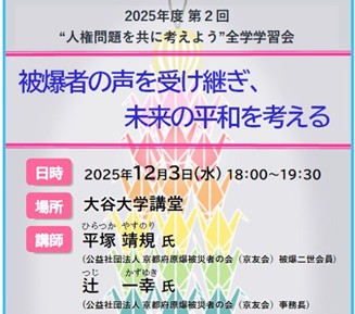 今回の学習会では、京都府原爆被災者の会に所属の平塚靖規会員(被爆二世会員)と事務局の辻一幸事務長をお招きし、戦争の悲惨さと命の尊さ、そして平和への切なる願いをお話しいただきます。