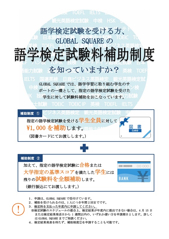 GLOBAL SQUAREでは、語学学習に取り組む学生のサポートの一環として、指定の語学検定試験を受けた学生に対して検定料補助を補助する「語学検定試験料補助制度」を設けています。積極的に利用してください。