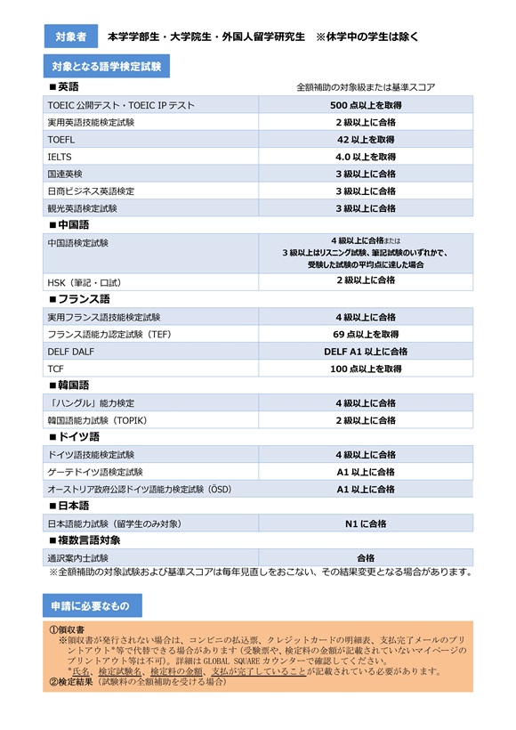 - 語学検定試験を受験した方全員に、1,000円の図書カードをお渡しします。また、大学が定める基準を満たした方には、全額補助を行います。