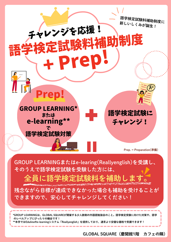 GLOBAL SQUAREでは、従来の「語学検定試験料補助制度」に加え「語学検定試験料補助制度 +Prep.」をスタートしました。