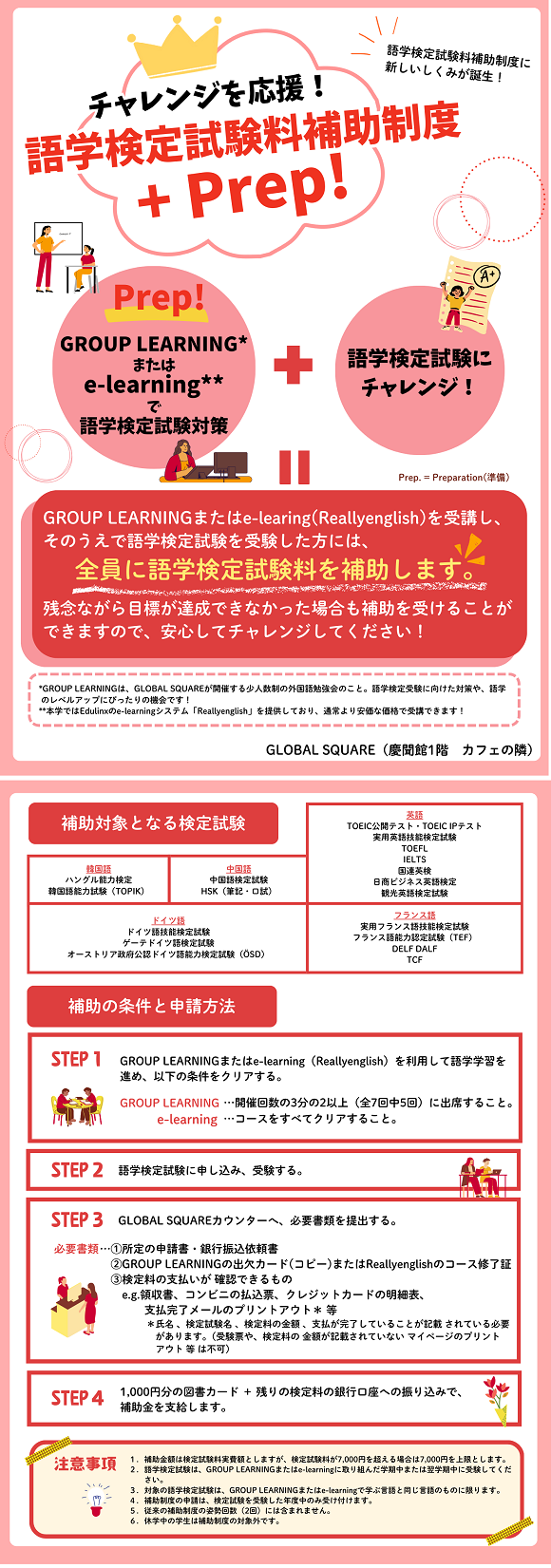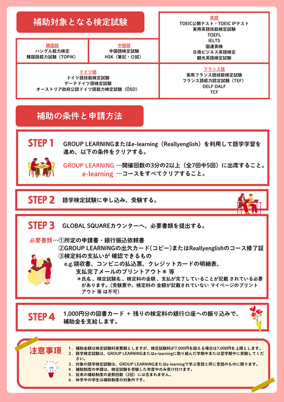 GLOBAL SQUAREが実施するGROUP LEARNINGまたは大学が提供するe-learning「Reallyenglish」を受講し、そのうえで語学検定試験を受験した方を対象に、検定試験の結果の如何に関わらず語学検定試験料を補助します。