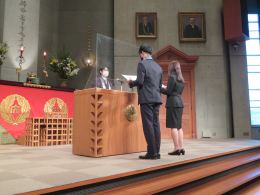 新型コロナウイルス感染症の感染防止の観点から、今年度も密集を防ぐため講堂で式典を挙行し、配席も間隔をあけての着席となりました。