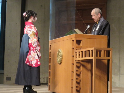 一楽学長は告辞で、「大谷大学での学びでは、たくさんの人や文献との出会いを通して、ものの見方が深くなり、様々な関係の中で広い世界を見る眼を得られたでしょう。今の社会では、成果主義という価値観がはびこる中で、結果が出なければつまらない人生といわれますが、そのようなことはありません。本当に大切なこと、尊いこととは何であるのかを問い返す眼があれば、壁にぶつかったとしてもそこから一歩を踏み出せます。また、これから皆さんは大谷大学の卒業生、修了生であり、同窓会員の一員です。次に大谷大学で学ぶ方たちの応援をしていただきたいという願いがあります。そして、皆さんが壁にぶつかったとき、あるいは立ち止まって考えたいとき、ぜひとも大谷大学に訪ねてきてほしい」と述べました。