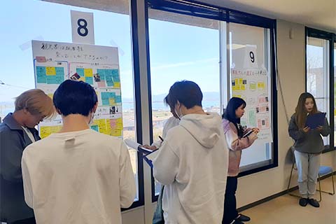 事後学習では大学での学びの基礎となる思考方法について説明があり、ブレインストーミングやKJ法等の考えや発想をまとめる手法を学びました。そしてフィールドワークで収集した情報をもとに、実際にKJ法で発想をまとめていく実習に入りました。まず各自がキーワード形式でメモを付箋に書き出し、グループで意見を出し合って分類していきました。他の人の発想と自分との違いや、様々な視点の整理などを実感的に学びました。