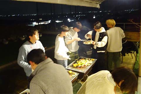 1日目のプログラム終了後は、湖西キャンパスセミナーハウスのテラスでバーベキューを楽しみ、担当教員や受講生同士で交流を深めました。