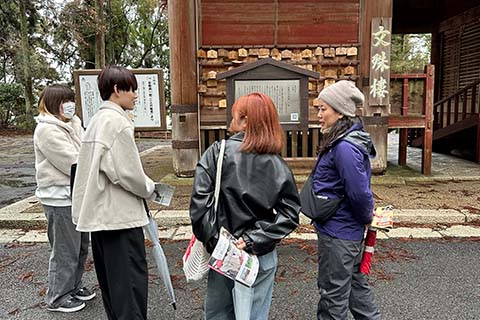 参拝者入り口から入場し、大講堂、根本中堂のある東塔エリアでフィールドワークを実施しました。グループで立てた問いを検証するため、観光客にインタビューをしたり、参拝する人たちの様子を観察しました。担当教員からのテーマに沿ったレクチャーに熱心にメモを取りながら説明に耳を傾けました。根本中堂が修復中でしたので、文化財の修復の様子も見学することができました。