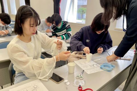 本イベントの開催あたっては、株式会社福永念珠舗の協力を受け、古くから日本人の生活や文化の中に深く根ざしている法具「念珠」の歴史的背景や作り方について講義を受講しました。学生達は念珠づくり自体に初めて挑戦するため複数回に渡って集まり、事前練習を重ねました。