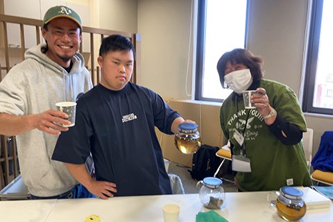 交流スペースでは、「まちの居場所プロジェクト」(担当教員:大原ゆい准教授)の連携先の1つである就労継続支援B型事業所 三休(以下、「三休」)のスタッフの方々より、ホーリーバジルブレンドのハーブティーが振る舞われました。