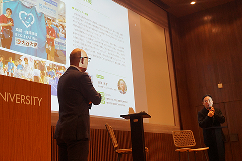 冒頭で本学学長一楽真から来場した皆様へ、日ごろの感謝と引き続いての本学の地域連携事業へのご協力のお願いをお伝えした後、本学が10年間で行ってきた様々な地域連携活動を紹介しました。はじめに、これまで実施してきた各プロジェクトを概観し、その後、2つのプロジェクトをピックアップして担当教員と連携先の方からの紹介が行われました。「モビリティデザインプロジェクト」(担当教員:野村実講師)の連携先の1つである京丹後市役所市長公室政策企画課の青木滉人様、「祇園祭ごみゼロ大作戦」(担当教員:赤澤清孝准教授)の連携先である一般社団法人祇園祭ごみゼロ大作戦理事長の太田航平様より、本学学生と行ってきた活動や今後の展望についてお話しいただきました。