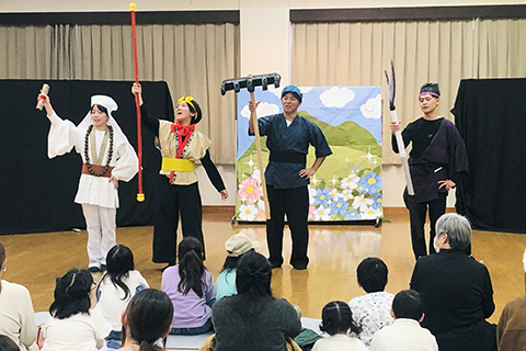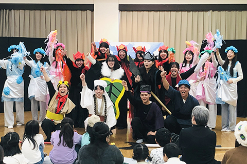 今回は「そんごくう(火えん山の巻)」と「金のがちょう」の2つの作品を上演しました。子どもたちの前で演じるのは、ほとんどの学生が初めての経験で緊張した様子でしたが、いざ幕が上がると、子どもたちに向けて大きな歌声で堂々と演じ、笑顔であふれる公演となりました。