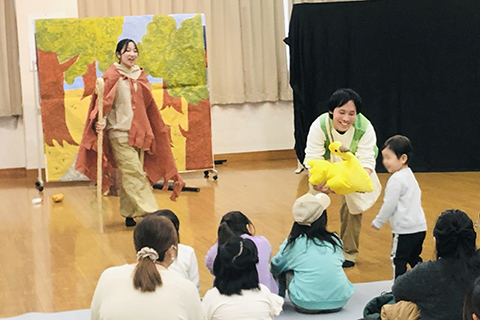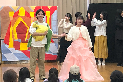2025年11月30日(日)に仰木の里公民館(滋賀県大津市)で、子どもの居場所づくり事業「みんなで楽しむオペレッタ」が開催され、本学教育学部教育学科幼児教育コースの第3学年の学生40名が子ども向けのオペレッタ(小さな音楽劇)を上演しました。冬晴れのもと、当日は地域にお住まいの親子など32名の方が観劇に来られました。