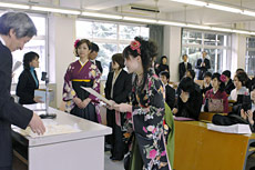 卒業式では、各学科の代表に学位記・卒業証書を手渡し、理事長・学長が祝辞を述べて終わりました。その後それぞれの学科毎に教室に集まり、学科の教員が見守る中、学科主任から一人一人にお祝いの言葉とともに学位記・卒業証書が渡されました。