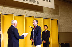また祝賀会の開催に先立ち、同窓会より「菩提樹賞」の贈呈式が行われました。菩提樹賞は、学術・文化・スポーツ・ボランティア活動などの分野で多大な成果や顕著な成績を挙げ、大谷大学の発展に貢献した学生・団体などに贈られるもので、本年は暁烏敏賞に論文が入選した真宗学科卒業の後藤靖さんと、『今昔物語』の中国語訳を出版した大学院修士修了の金 偉さんが選ばれ、藤島同窓会長より賞状が贈られました。