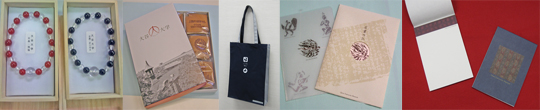 【写真左より、大学ロゴ入りブレス型念珠(桐箱入り)/瓦せんべい/ 大谷大学博物館ミュージアム・グッズ トートバッグ/大谷大学博物館ミュージアム・グッズ クリアファイル/大谷大学博物館ミュージアム・グッズ ミニ便箋(赤・青各色)】
