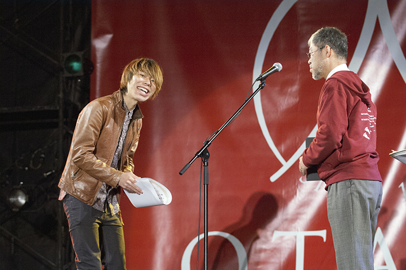 表彰は学生部長が優秀な展示に贈る「学生部長賞」「努力賞」、同窓会イベントのホームカミングデーに来場された方々の投票で決定する「模擬店表彰」です。今年の学生部長賞は、多彩なバンドの出場と観客動員数が評価されたジャズ研究会が受賞しました。また、努力賞には、寄席で会場を沸かせていた落語研究会、ブルーグラスというジャンルの音楽を演奏したアメリカ民謡研究部、自分で作ったスライムを壁に投げつけるというユニークな企画が好評だったカラターニ軍団、の3団体が選ばれました。模擬店部門では、おにぎりと豚汁という伝統ある味で来場者の舌とこころをつかんだ自灯学寮が表彰されました。また、京都府広報監「まゆまろ」も登場し、一緒にお祝いをしました。