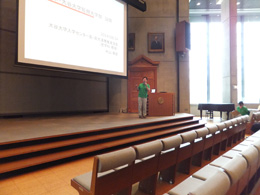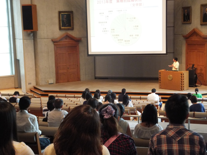 午前10時からは、大学説明会が行われました。はじめに学生スタッフより当日のスケジュールについて説明があり、そして入学センター長の村山先生より、大谷大学とはどういう大学なのかなどの紹介がありました。その後、キャリアセンターより進路就職支援についての説明がなされました。
