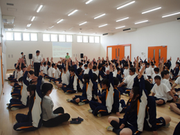 初めは少し広がって、後ろの方に座っていた生徒が、講義の終わりには前にギュッと集まって座っている変化を見ることができました。仲間と共に動くことで緊張がとけ、心が変化していく様子を実感することができたと思います。