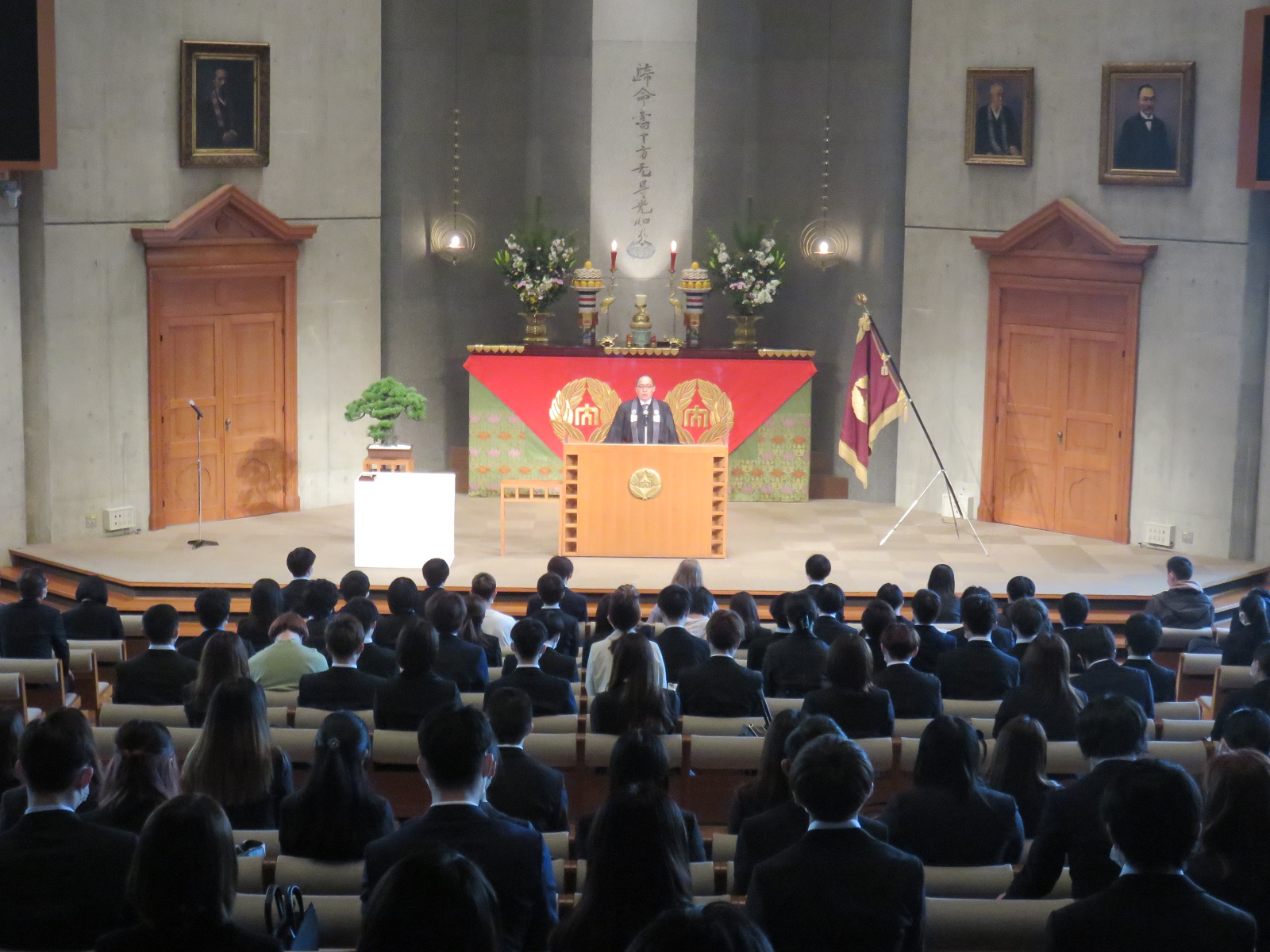 新型コロナウイルスによる感染状況に鑑み、式場への入場を2020年度入学生と教職員に限定し、4部制で実施するなど、感染防止対策を講じて執り行いました。