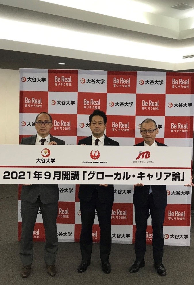 「グローカル・キャリア論」とは、日本航空株式会社様(以下、JAL)、株式会社JTB様(以下、JTB)と共同で、本学の国際学部生を対象とした産学連携講座です。航空・旅行業界を代表するJAL,JTBが共同で大学の講義を行うのは、今回が初となります。