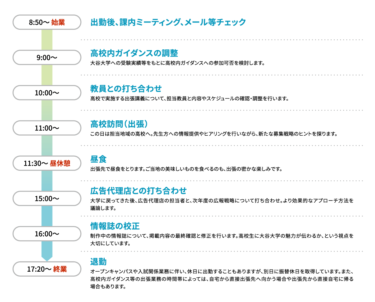 高校内ガイダンスで私の話を聞いてくれた生徒が、オープンキャンパスにも参加し、大谷大学を受験し、最終的には入学してくれたんです。そして、入学後はオープンキャンパスの学生スタッフに登録して、運営に関わってくれました。その学生が「大学の授業、面白いです」と話してくれた時は、自分の仕事がミスマッチなく誰かの未来に繋がったのだと実感でき、本当に嬉しかったです。この仕事をしていて良かったと心から思いました。