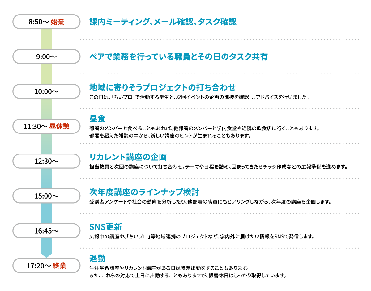 私は、教育研究支援部教育研究支援課で、主に社会連携に関わる事業を担当しています。いわば大学と社会を繋ぐ役割です。一般の方向けの生涯学習講座やリカレント講座では、講座の企画から担当教員をはじめとする関係者間の調整や当日の運営まで一貫して携わります。また、地域課題に取り組む学生主体のプロジェクトでは、その立ち上げから活動支援を行っています。時にはプロジェクトの現場に足を運び、学生が子育て支援活動を行ったり、コミュニティ食堂で活動したりする様子を取材して記事を作成することもあります。企画も、広報も、運営も、幅広い業務を担うことができるのが、この仕事の面白さです。